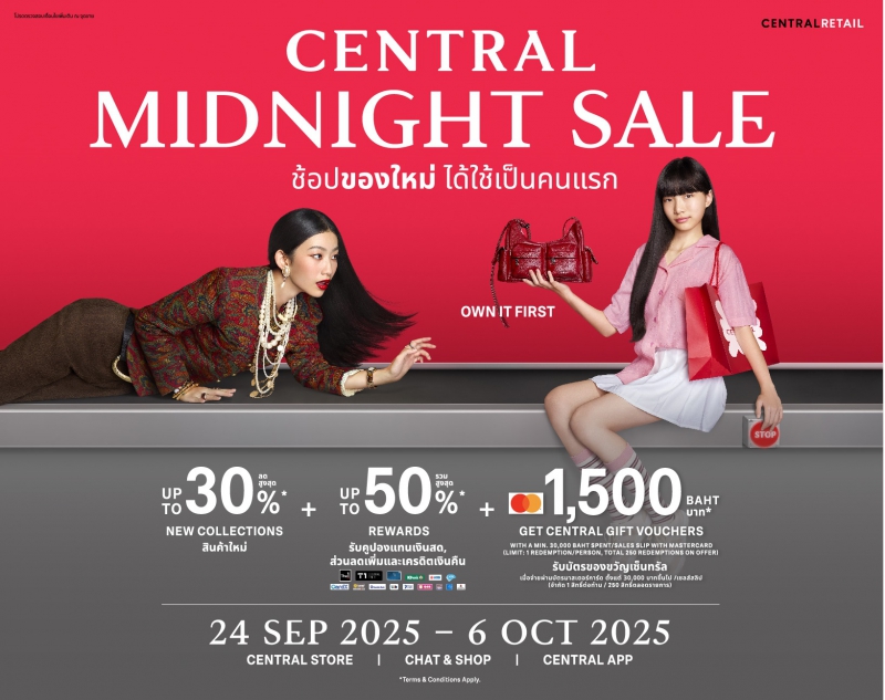 พบกับแคมเปญ “Central Midnight Sale : Own it First ช้อปของใหม่ ได้ใช้เป็นคนแรก” ตั้งแต่วันที่ 24 ก.ย. 68 – 6 ต.ค. 68 ที่ห้างเซ็นทรัลทุกสาขา และช้อปต่อเนื่องได้หลากหลายช่องทางการช้อปปิ้งสุดสะดวกของห้างเซ็นทรัล ทั้ง Central App ช้อปบนเว็บไซต์ www.central.co.th, ช้อปผ่านช่องทาง Central Chat & Shop, Call & Shop 1425 หรือช้อปผ่านเฟซบุ๊กไลฟ์และอินบ็อกซ์ของห้างเซ็นทรัล Facebook Page : Central Department Store คลิก https://www.facebook.com/CentralDepartmentStore หรือ Central Tiktok Shop